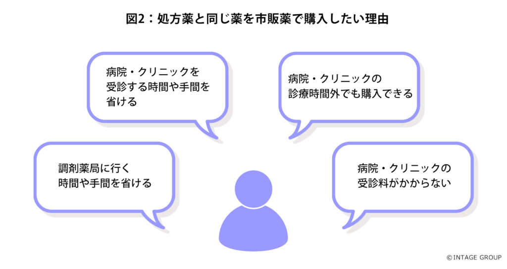 - 市販薬を購入したい理由は「受診する時間や手間を省ける」「受診料がかからない」などの利便性や経済的なメリットが多数