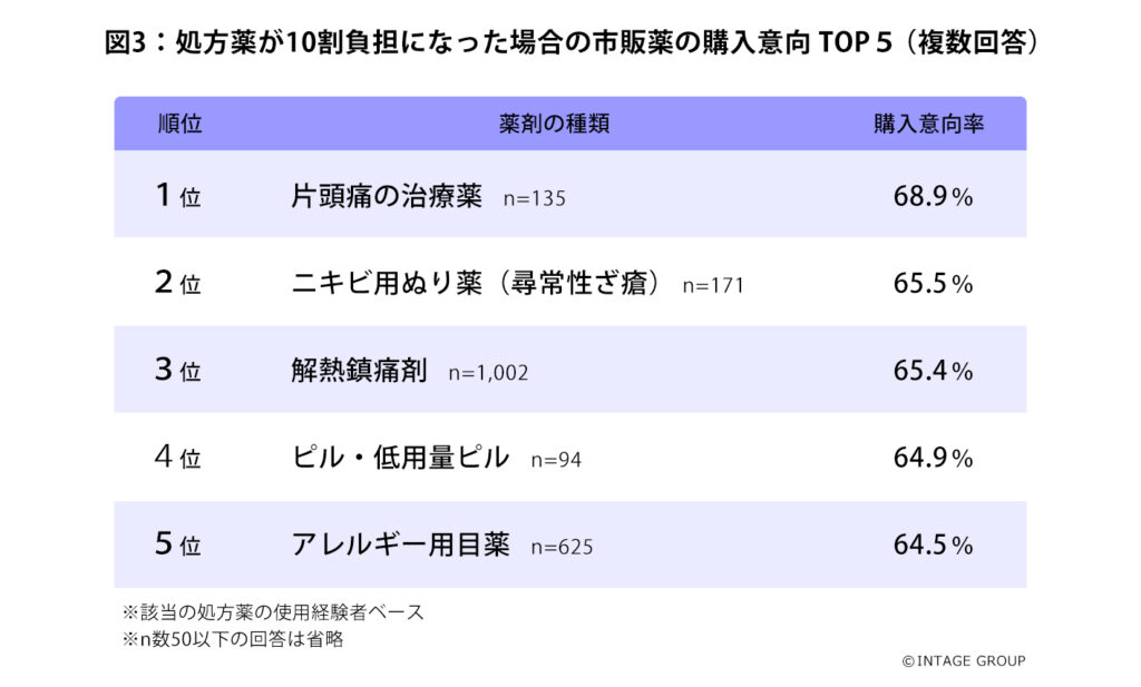 次に、処方薬が保険適用外(自己負担額10割)になったと仮定し、該当の処方薬の使用経験がある人を対象に、その薬剤の市販薬の購入意向を確認しました。その結果「片頭痛の治療薬(68.9%)」「ニキビ用ぬり薬(尋常性ざ瘡)(65.5%)」「解熱鎮痛剤(65.4%)」「ピル・低用量ピル(64.9%)」「アレルギー用目薬(64.5%)」が高い結果となりました(図3)。「片頭痛の治療薬」や「ピル・低用量ピル」など、現時点で市販薬として販売されていない薬剤であっても、実際に処方薬を使用したことがある人のうち一定数は、市販薬として買いたいと考えていることが明らかになりました。