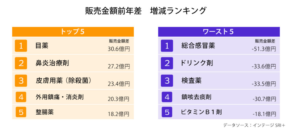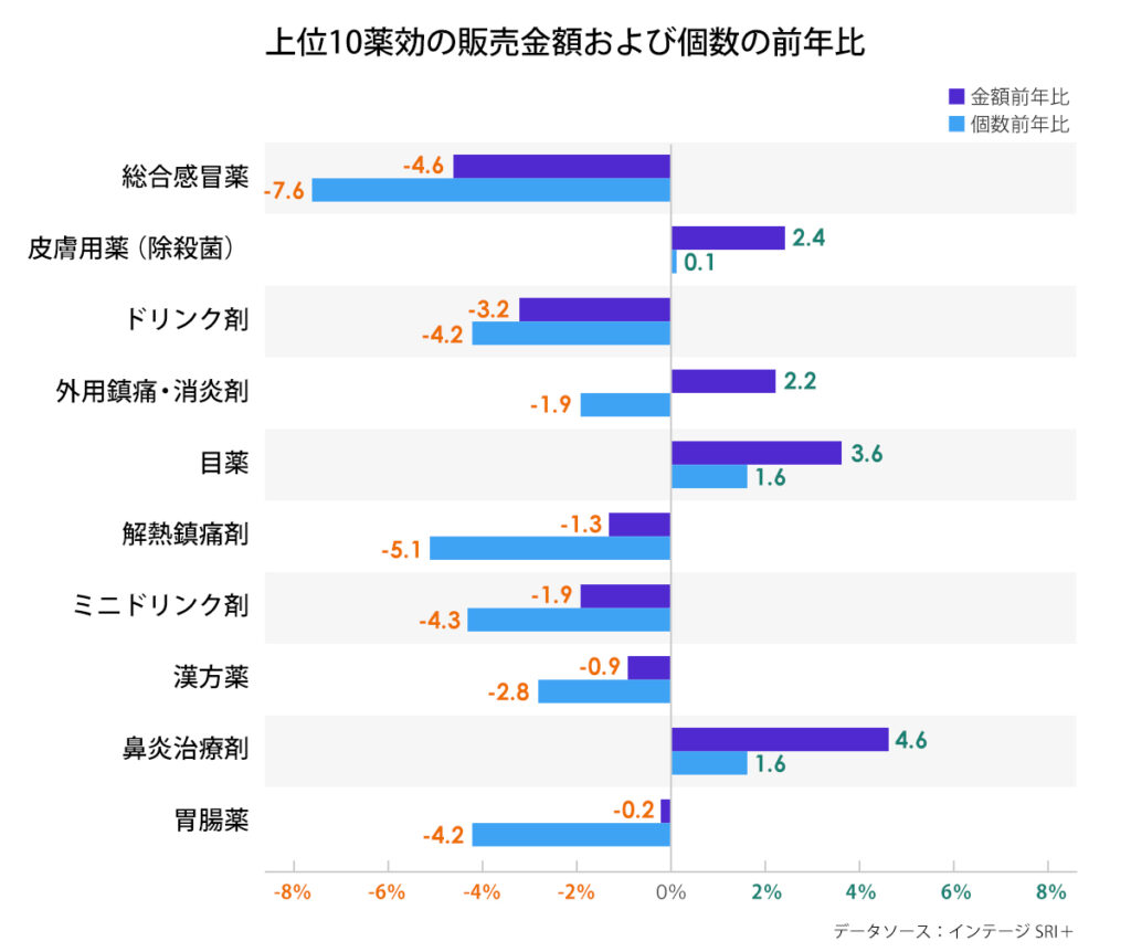 また、上位10薬効で金額・個数ともに前年を下回ったのは、総合感冒薬、ドリンク剤、解熱鎮痛剤、ミニドリンク剤、漢方薬、胃腸薬の6薬効でした。一方、金額・個数ともに前年を上回ったのは、皮膚用薬(除殺菌)、目薬、鼻炎治療剤の3薬効でした。