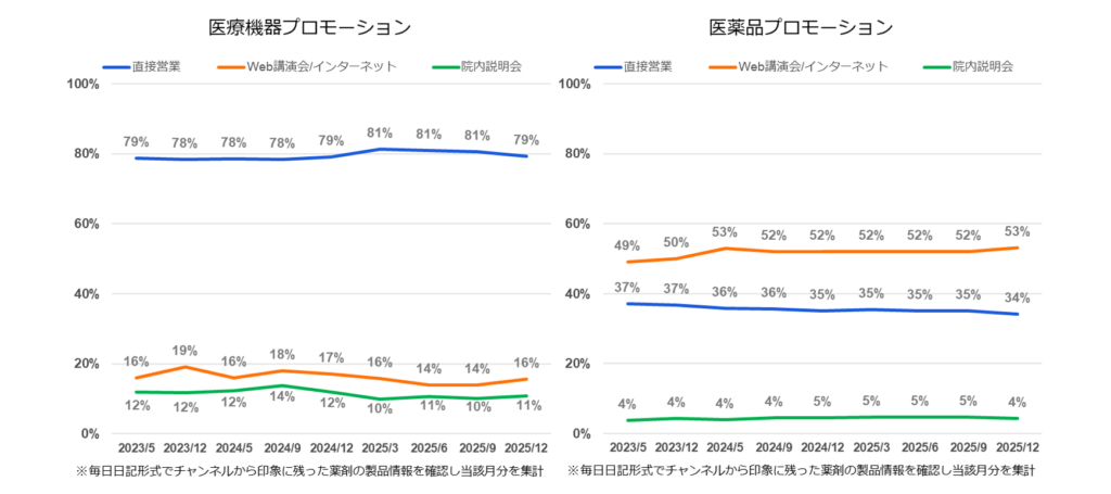 2025年12月の結果を確認したところ、今回の調査でも「直接営業」からの情報入手割合は79%で、過去調査と同様に最も多い情報源となりました。「Web講演会/インターネット」は16%、「院内説明会」は11%で、前年同月である2024年12月の調査と比較しても、同様の傾向でした。 また、「製薬企業のプロモーション活動」を日記形式で確認している調査Impact Track※3においても、今回の医療機器の調査対象セグメント(6診療科・200床以上)に合わせて算出したところ、「医療機器の製品情報の入手状況」同様、2025年9月の調査と比較して大きな変化は見られませんでした。