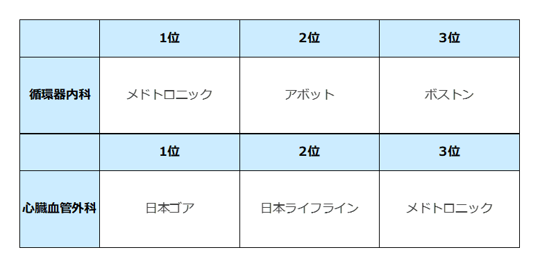 - 医師の印象に残っている医療機器メーカーのランキングTOP3※1は「心臓血管外科」「消化器外科」に変化
